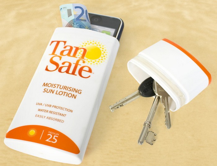 Вот для курортников и создан специальный кошелек для ценных вещей, который имеет вид обычного флакона с кремом от загара. В нем легко помещаются мобильный телефон, деньги и еще несколько предметов по вашему усмотрению.